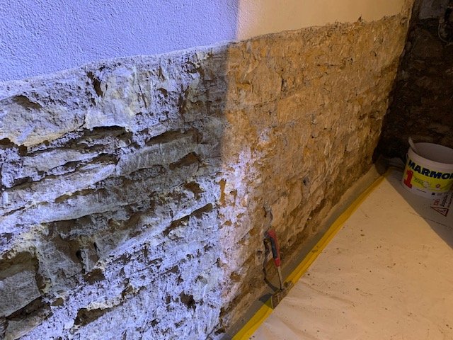 Hier wurde der alte mürbe Putz entfernt und die Mauer von innen her konventionell gedichtet und verputzt.