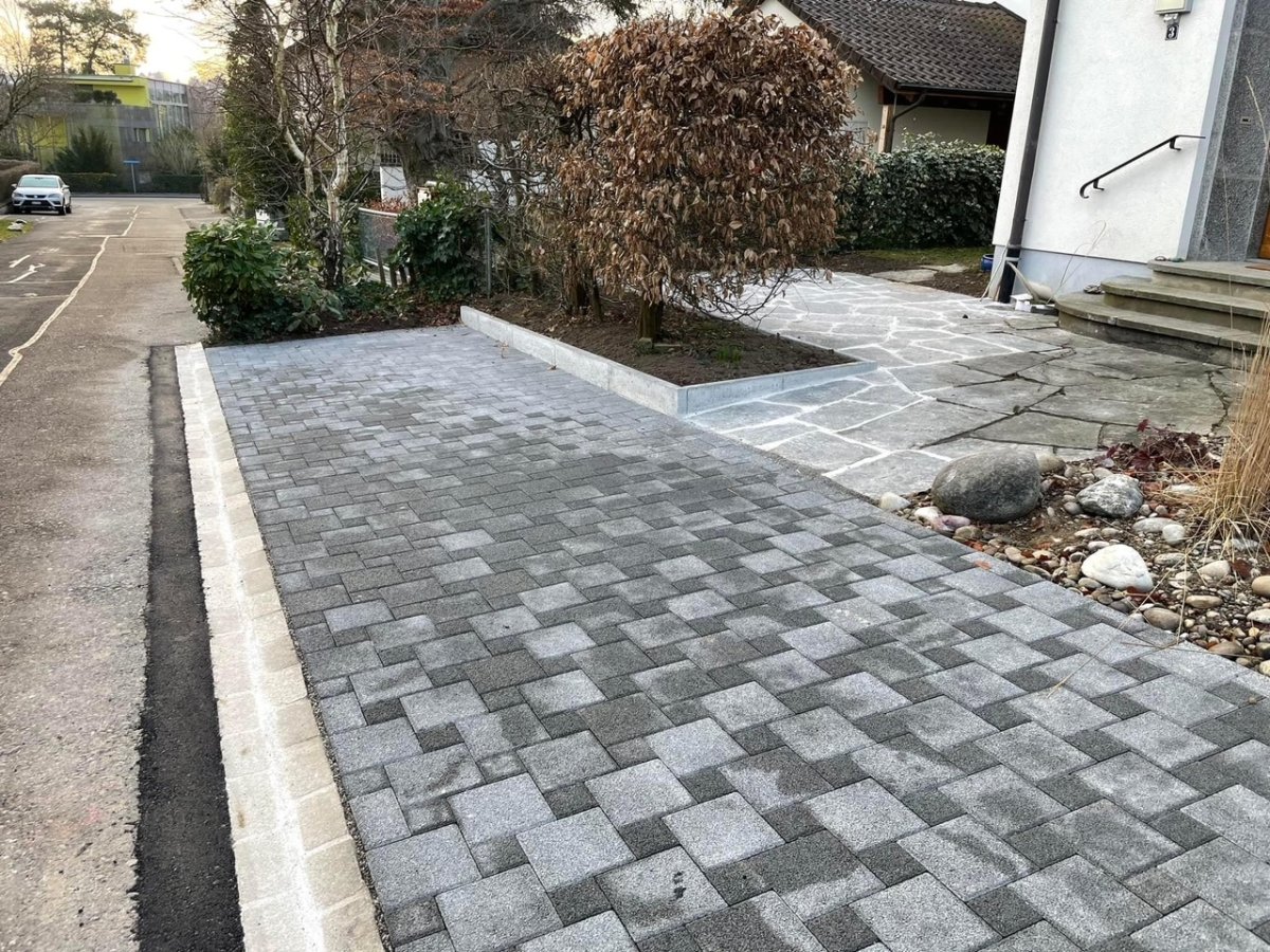 Hier wurde die Umgebung angepasst. Ein neuer Parkplatz mit Sickersteinen und anpassungen mit schönen formwilden Granitplatten. Alles mit einem stabilen Untergrund.