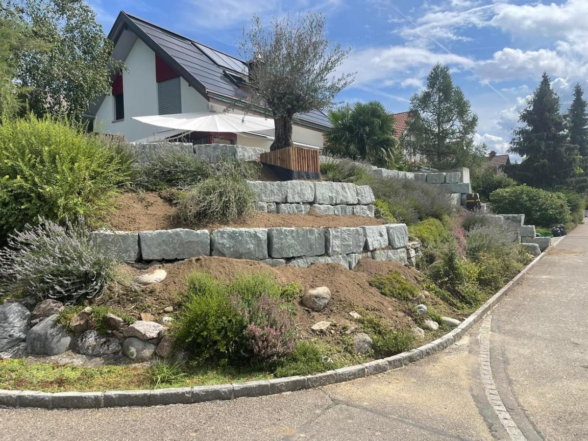 Hier wurde eine Böschung mit einer Stützmauer aus Andeer Granit (Schweiz) verschönert und gesichert.